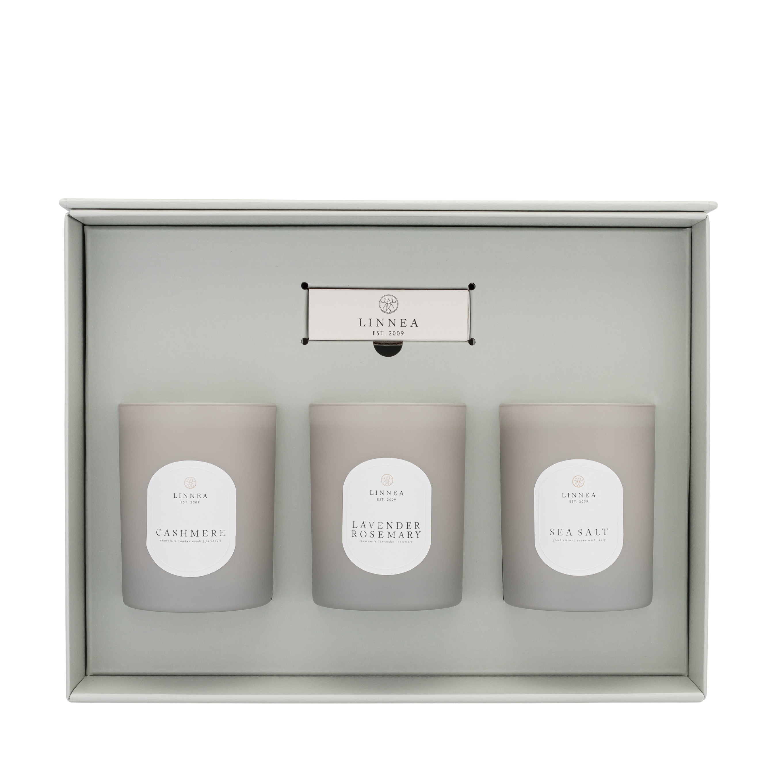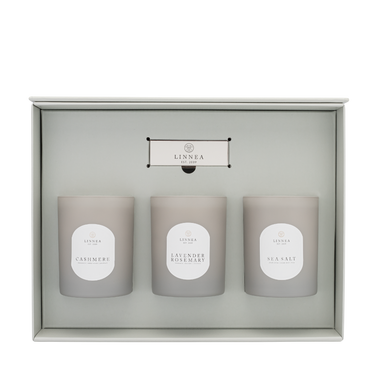 The Bestseller Giftset features three beloved Large Candles Lavender Rosemary, Cashmere, and Sea Salt. Each scent sets its own mood, creating a timeless trio that feels inviting and effortless. Presented in our signature grey textured paper box with embossed detailing, the unwrapping reveals candles nestled in crisp tissue with a custom seal for a refined ritual. Designed for LINNEA Layering, this set lets you blend herbal calm, soft warmth, and clean coastal clarity to create a perfectly balanced fragrance story. Ideal for gifting or elevating your everyday moments.