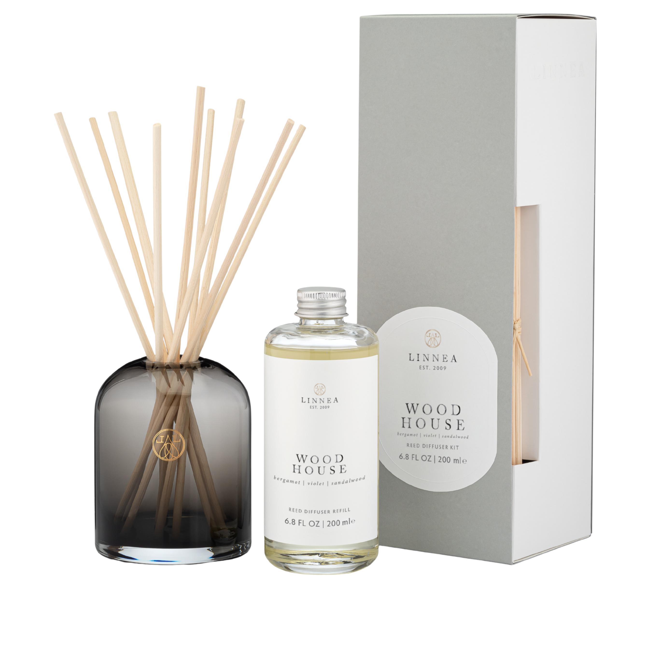 A sophisticated blend of bergamot, violet, and sandalwood, creating a serene and refined ambiance. This set includes a mouth-blown glass vessel, premium fragrance oil, and natural rattan reeds for optimal scent diffusion. Perfect for effortless home fragrance, it’s a luxurious gift option.